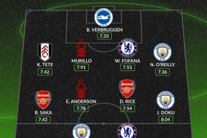 中场:萨卡(阿森纳,7.42分)、埃利奥特·安德森(诺丁汉森林,7.78分)、赖斯(阿森纳,7.54分)、杰里米·多库(曼城,8.04分)