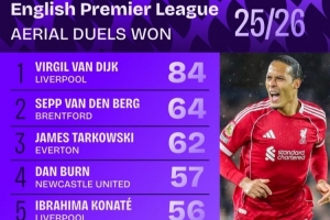 此外,范戴克争顶成功率为80%,在所有至少参与25次及以上争顶的球员中,成功率最高。