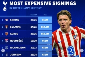体育资讯1月15日讯 热刺已经官宣签下马竞中场加拉格尔,《转会市场》也统计了热刺队史引援榜情况,哈维·西蒙斯等4将超过6000万欧元。