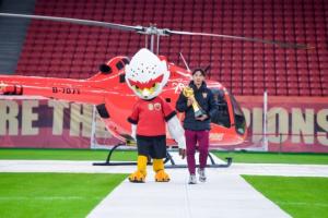 激动人心的夺冠视频过后,大家的目光被静候在内场的临港捷运纪念版直升机吸引,仪式开始前,这架直升机载着王燊超和奖杯从川沙飞抵球场。这一环节不仅是荣耀的展示,更是俱乐部积极探索“低空+足球”体旅融合新范式的生动实践。随后,王燊超与俱乐部总经理沙良昌共同将新赛季冠军奖杯安放于柱顶,与三座往届火神杯组成“冠军奖杯矩阵”,将现场氛围推向高潮。