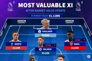 体育资讯3月10日讯 德转在北京时间3月9日更新了英超球员身价,并列出了更新后英超身价最贵阵,哈兰德2亿欧领衔,凯塞多、维尔茨在列,11人中有阿森纳5名球员。