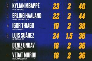5、路易斯·苏亚雷斯(葡萄牙体育,24球,系数1.5):36分