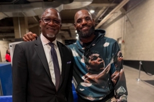 赛后,随队来到洛杉矶的老鹰名宿、现任球队篮球事务副总裁威尔金斯也和詹姆斯打了照面。他还晒出了两人的合照,并配文:“比赛后和你聊上几句真的很开心,总是很享受这种轻松交流的时刻。”