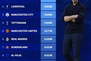 体育资讯2月5日讯 本赛季五大联赛冬窗结束,德转统计了本赛季净支出最高的球队排行榜。